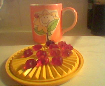 Und dazu ess ich Gummizeugs. Die Sterne schmecken nach Glühwein, die Herzen nach Punsch. Lecker. Hab ich mir letzten Nov. beim Martiniloiben im Burgenland (gr. Weinverkostung mit allem pi-pa-po) gekauft.